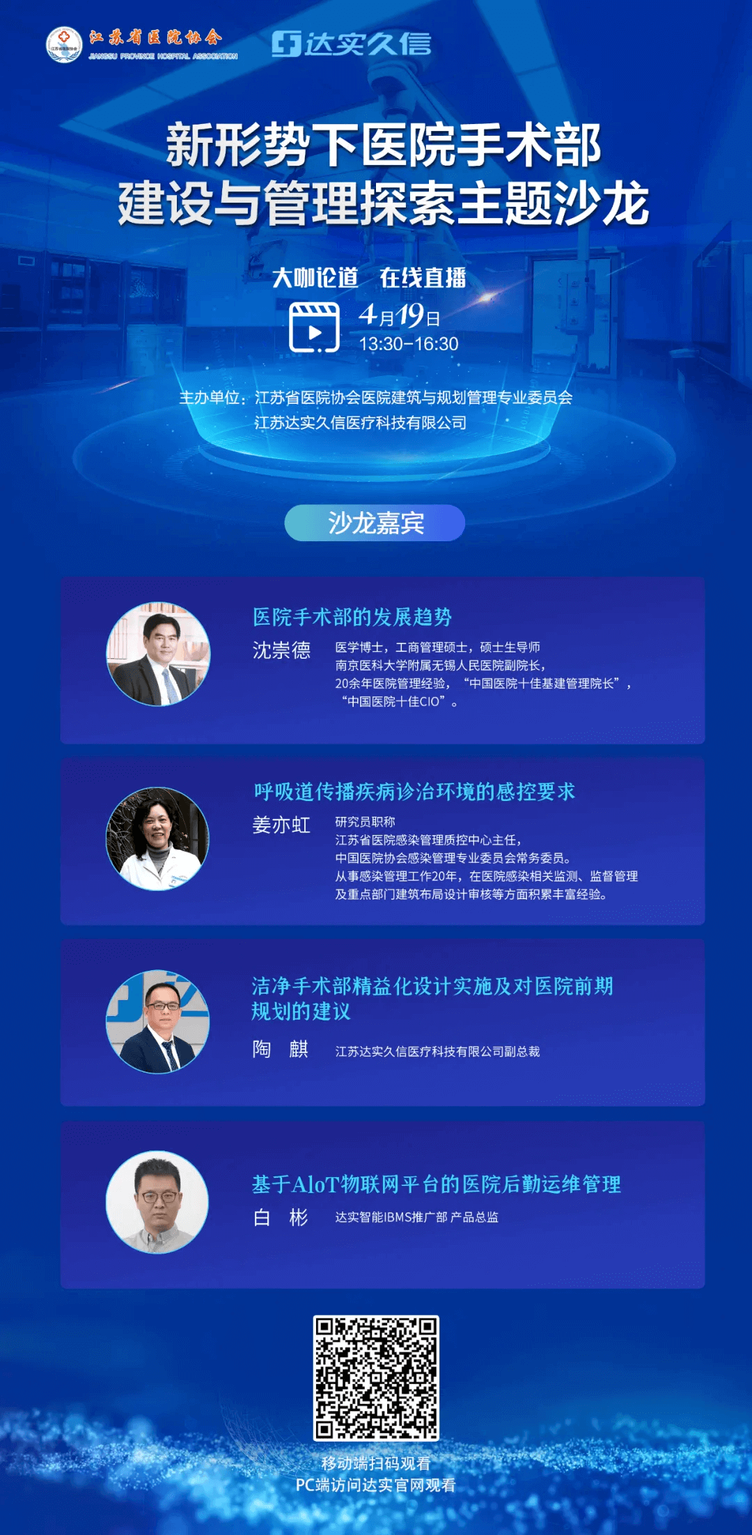 4月19日 13:30-16:30,達實久信聯(lián)合江蘇省醫(yī)院協(xié)會醫(yī)院建筑與規(guī)劃管理專業(yè)委員會,邀請十多位相關(guān)醫(yī)療領(lǐng)域的專家、大咖,共同舉辦醫(yī)療行業(yè)主題沙龍:【新形勢下醫(yī)院手術(shù)部建設(shè)與管理探索】,與大家共同探索醫(yī)院手術(shù)部建設(shè)的當下與未來。